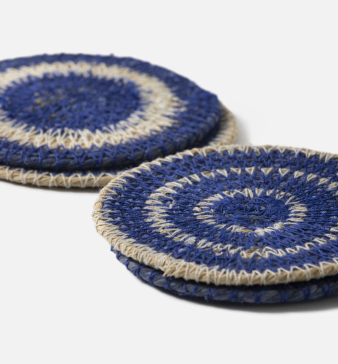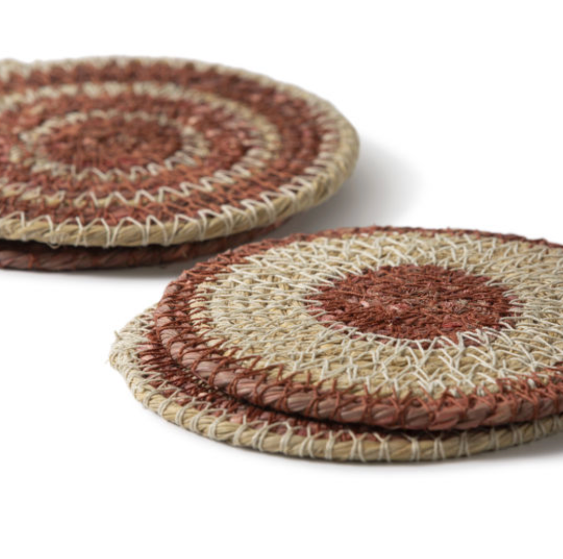 Bring natural charm to your table with the Agora woven coasters. The four-piece set showcases unique two-tone circular designs, each with playful variations in width and spacing.